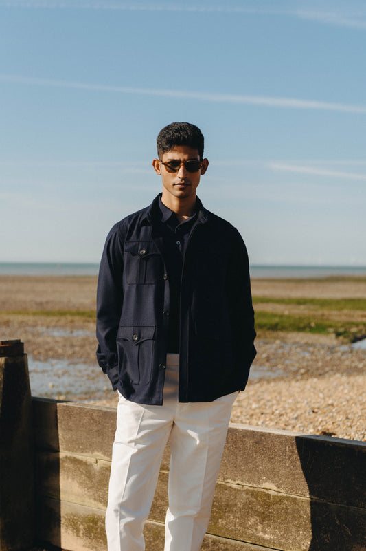 Cut to our classic Safari shirt block, with four pockets and horn button closures, this supremely soft and luxurious midnight blue cashmere safari shirt will provide a real sense of luxury and comfort. Woven by one of the UK’s most loved and historic woolen mills, it has been produced in a medium 11 oz weight, ensuring versatility and ease of wear.