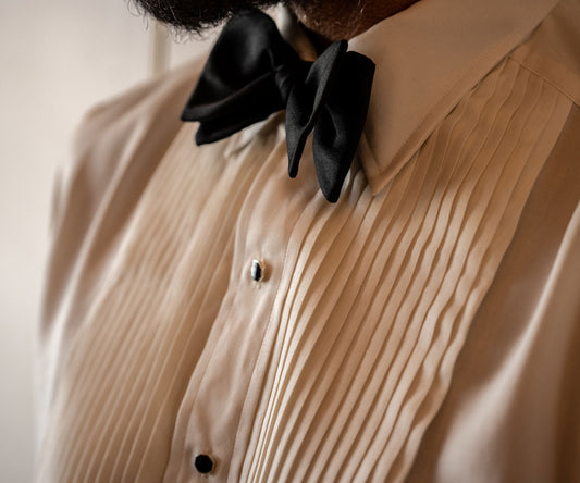 Available in a choice of luxurious English spun silk in cream, or a crisp white poplin, this Tailored Fit dress shirt has two darts on the back for extra shape and features a soft collar, and delicate hand-pleats, meticulously worked and sewn 1/4" apart. The labour-intensive and highly skilled nature of these shirts, mean that they are normally only available to bespoke customers and have not been offered in Budd's ready to wear collection for over fifty years. The shirts feature 3 x 3/8* stud holes so as to be worn with your favourite dress studs. Each shirt really is a true work of art.