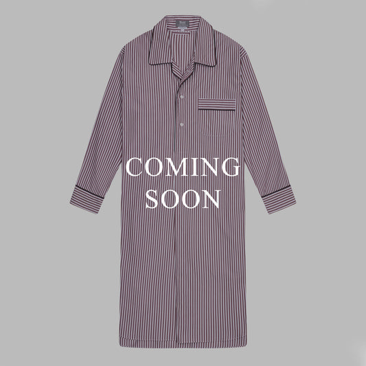 A comfortable and luxurious men's nightshirt cut from the latest colourway in Budd's iconic house stripes - Burgundy. The deep red stripe is brought to life by the fine white sateen twill and black hairline stripes that accompany it. Sits just below the knee. Pair with matching dressing gown.